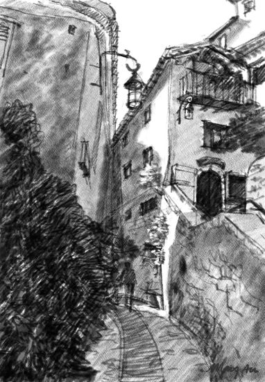 A series of black and white sketches capturing shapes, light and mood with intricate details and textures.